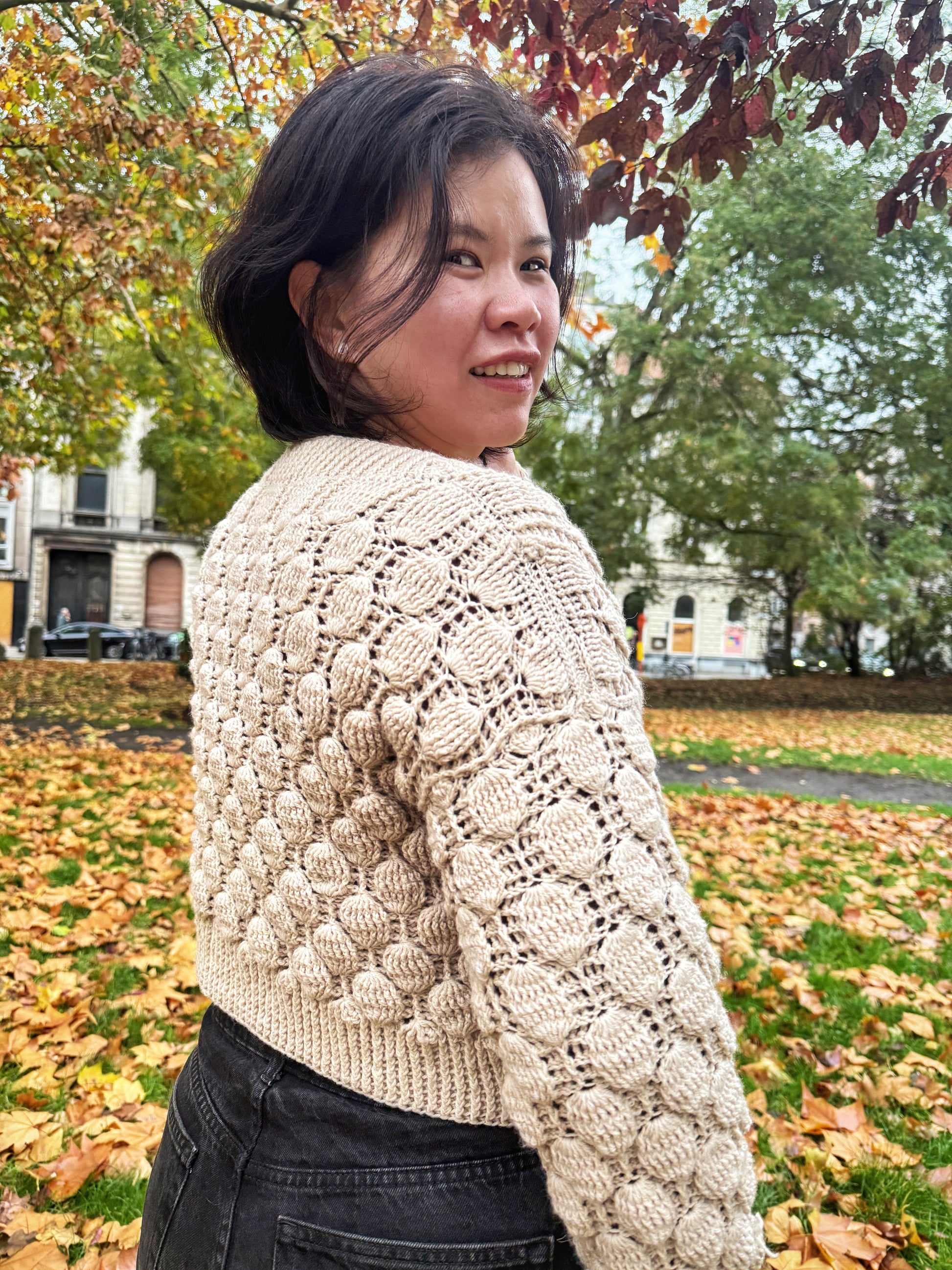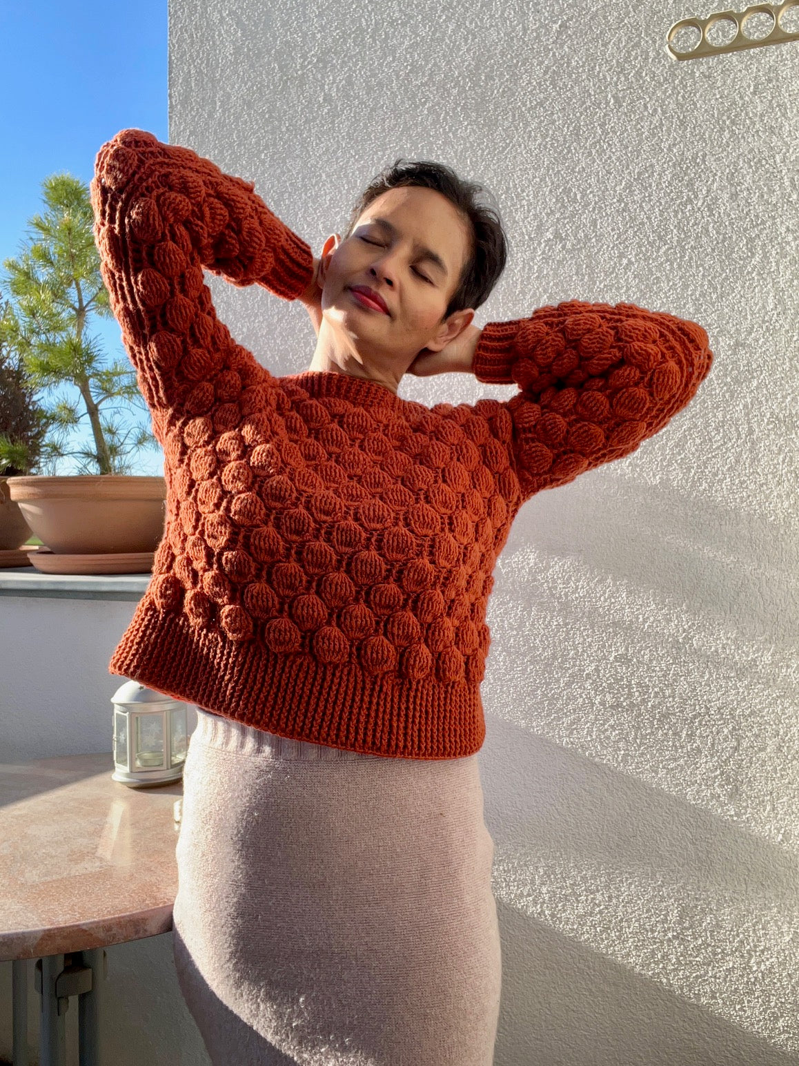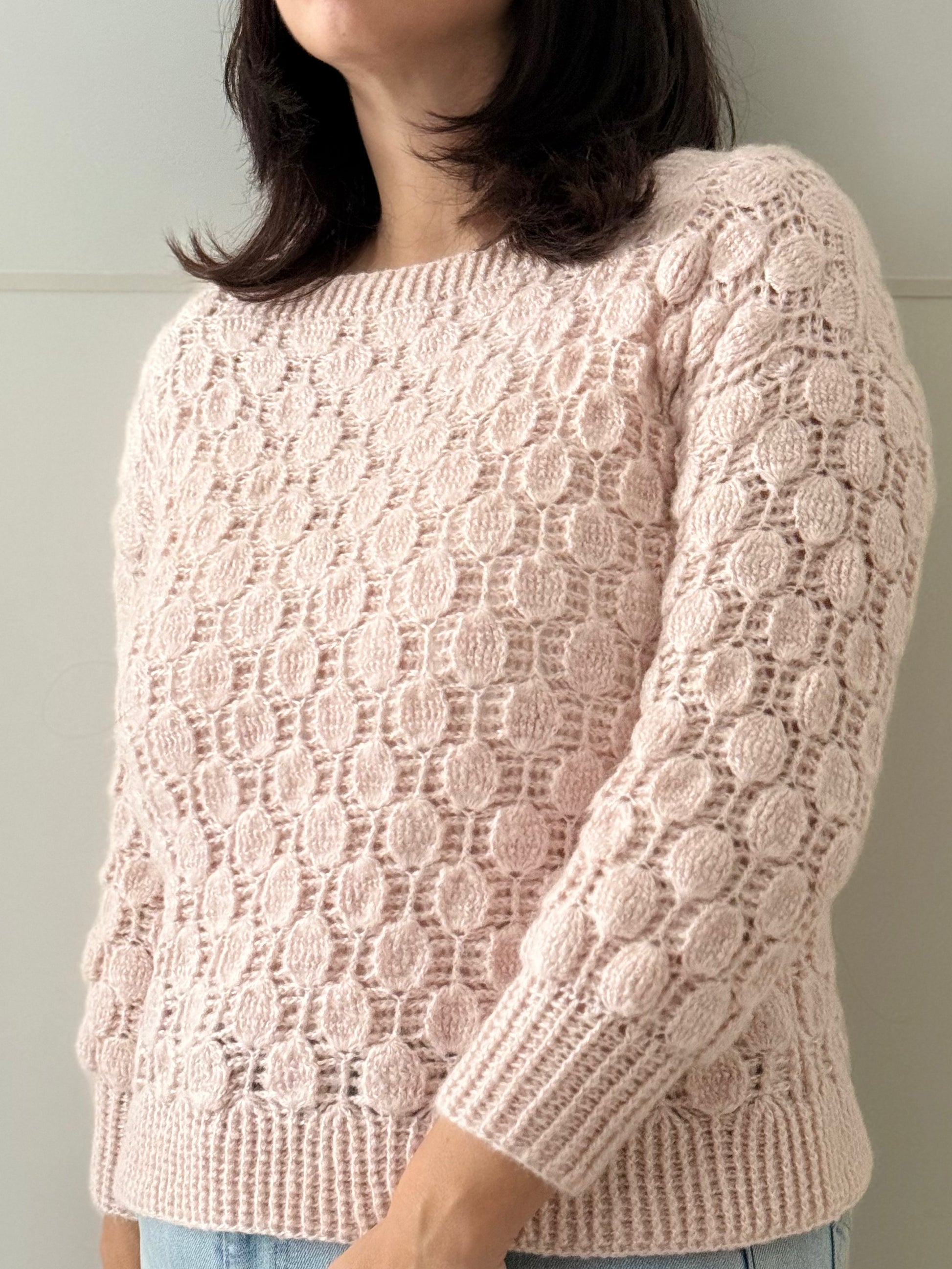 Bubbly jumper is an oversized sweater, featuring square neckline and gentle shoulder slope. The back and front parts are crocheted separately, then the shoulder seams are sewn together. Then each sleeve is crocheted directly on the body panels. The side of sleeve, back and front panels are sewn together. The square neck, cuffs and body ribbing are then crocheted right onto the finished piece.