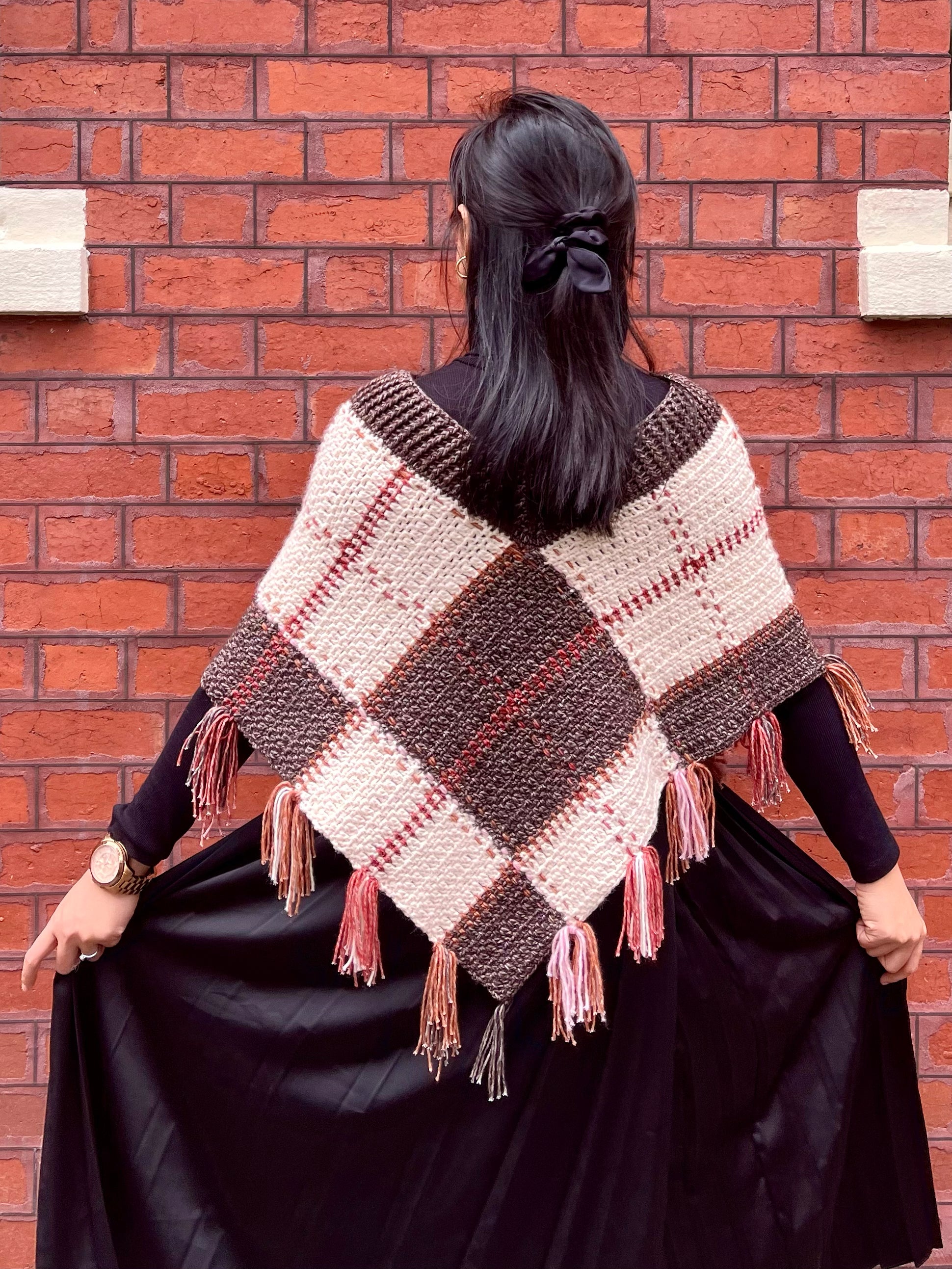 The design is in one big U shape flat panel, worked in minimum 2 colors to 5 colors combination. The stitches are added after the panel is done, the whole panel then to be folded in half and seam along arm side. Finally, neck ribbing and tassels will be added for finished look.